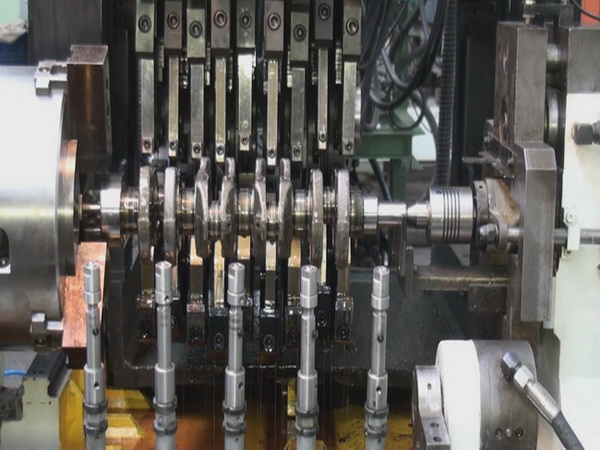 3.滾壓四缸機(jī)曲軸:滑臺橫向進(jìn)給,九個夾鉗油缸通過滾壓頭分別夾緊工件上各自對應(yīng)的主軸頸和連桿頸,此時潤滑油開。滾壓時九個夾鉗油缸按預(yù)定壓力進(jìn)行加卸載,按設(shè)定滾壓圈數(shù)完成滾壓。滾壓完成后滾壓裝置退出。