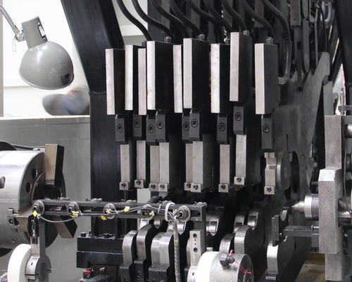 機床一次裝夾可實現(xiàn)曲軸所有主軸頸、連桿頸上的沉割槽圓角滾壓、在線測量、滾壓校直的自動加工全過程,工作效率高,勞動強度低,調(diào)整方便,機床采用懸掛式九鉗結(jié)構(gòu)系國內(nèi)外首創(chuàng),突破了導軌式曲軸圓角滾壓機床目前只設(shè)置5個滾壓鉗的局限。